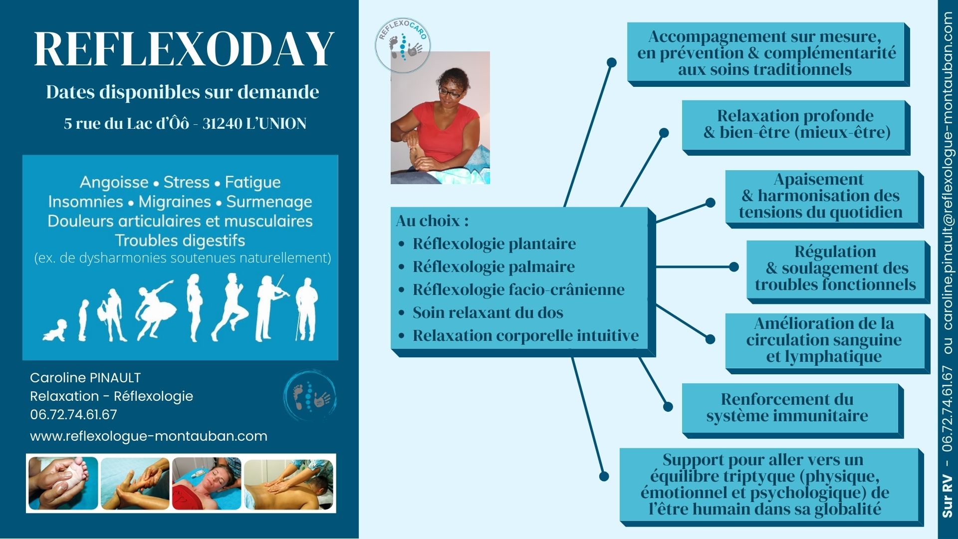 Prochaine journée REFLEXODAY à l’Union (31) : samedi 6 juillet 2024. Au choix : séance de réflexologie ou soin relaxant du dos. Sur RDV.